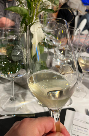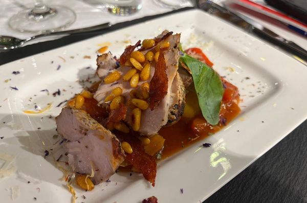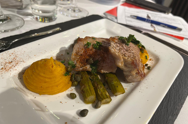 Am Beispiel des Chardonnay Bourgogne der Domaine Moillard, der das Iberico-Rückensteak mit Kürbispüree begleitete, lässt sich das hervorragend aufzeigen. Die Aromen von gerösteten Mandeln sowie reifen, gelben Früchten und Vanille bildeten einen harmonischen Kontrast zu den feinen Röstaromen des Fleisches. Die Cremigkeit des Weins paarte sich ideal mit der Cremigkeit des Kürbispürees. Wahrscheinlich wurde nicht nur am Tisch des mitschreibenden Blog-Redakteurs lebhaft darüber diskutiert, wie aufregend sich das Geschmacksbild sowohl des Essens als auch der jeweiligen Weine änderte. Je nachdem, ob die “kulinarischen Komponenten” alleine oder in Kombination verkostet wurden.