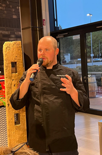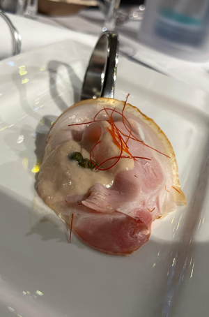 Maurice Momberg, gelernter Koch und Fleischsommelier aus Nordhessen, betreut das regionale Strohschweinprogramm und konnte somit als Experte allererster Güte Wissenswertes zu den einzelnen Gängen an die interessierten Gäste weitergeben. Gleich zu Beginn etwa begeisterte die Vorspeise, die als “Surprise” angekündigt war. Als Löffelgericht entzückte eine Spielart des bekannten Vitello Tonnato (also Kalb und Thunfisch) — hier und heute aber zubereitet mit dem zarten Fleisch des Strohschweins, weswegen es sich Maurice Mombach auch nicht nehmen ließ, ein vorzügliches “Vitello Strohnato” anzukündigen.