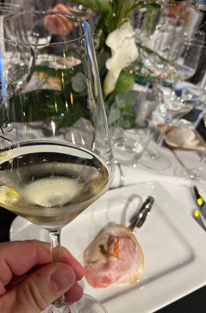Um Punkt 18.00 Uhr griff Gastgeber Thomas Köhler zum Mikrofon und begrüßte alle Gäste aufs Herzlichste. Diese konnten sich vorher bereits an zwei Dingen erfreuen: Zum einen an der auf dem Tisch annoncierten Menüfolge, zum anderen an einem Gläschen Brut Dargent Reserve, verfeinert mit einem Hauch Cassis. Wie alle Schaumweine von Brut Dargent wurde auch diese Cuvée aus Chardonnay und Pinot Noir nach der “Méthode Traditionelle” erzeugt, der traditionellen Flaschengärung also. Hierzu reift der Tropfen nach der zweiten Gärung noch weitere 18 Monate auf dem Hefelager. Der Lohn: Ein ausdrucksstarker Duft mit Aromen von Apfel, Mirabelle und Mandarine sowie Anklängen von Apfelschale und Zitronenzeste im Hintergrund. Am Gaumen überzeugt er dann mit saftigem Charakter und gutem Mousseux, frischer Frucht, feinen Noten von grünem Apfel, Zitruszesten, roten Johannisbeeren und einer fast salzigen Mineralik und dezenter Kräuterwürze. Letztere Komponenten konnten auf Nachfrage in einem Probeschluck ohne die Cassis-Zugabe “erschmeckt” werden.